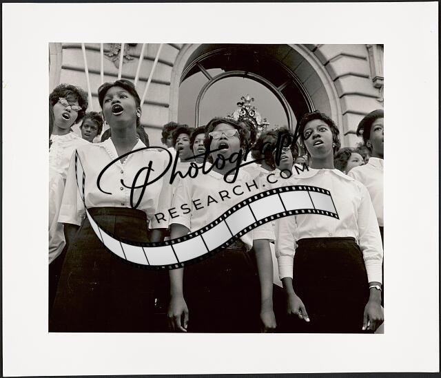 [[Youth Choir singing at a civil rights demonstration in San Francisco, California; primarily women, with the city hall in the background]]