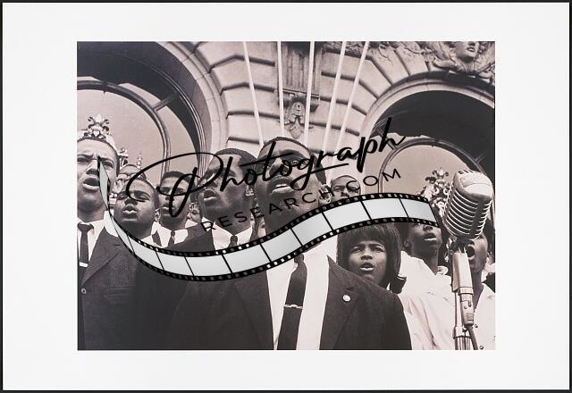 [[Youth Choir singing at a civil rights demonstration in San Francisco, California; primarily men, with city hall behind them]]