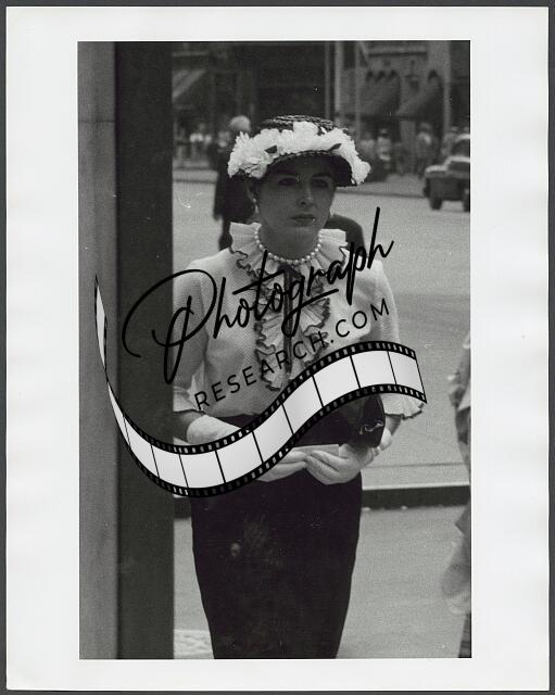 [[Woman, full-length portrait, walking on sidewalk, looking down, holding her jac