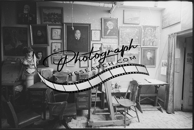 [[Studio interior with wall covered in portrait artwork]]