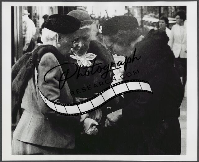 [[Three women huddled together on New York City sidewalk]]