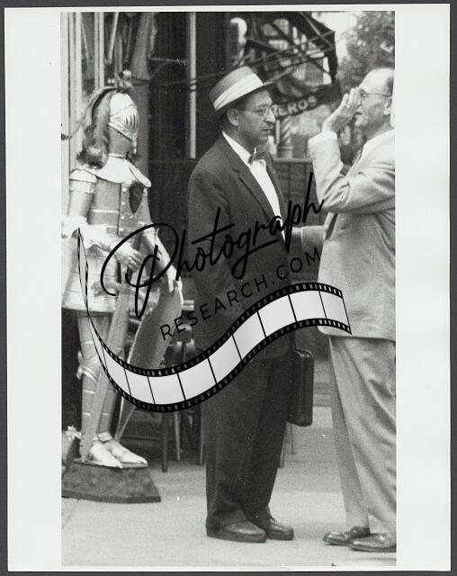 [[Two men in conversation standing next to suit of armor replica with sword and s