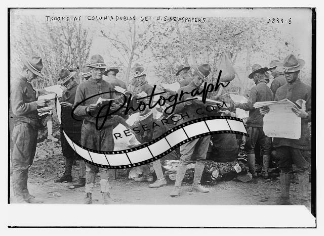 Troops at Colonia Dublan get U.S. Newspapers,soldiers reading papers,Bain News
