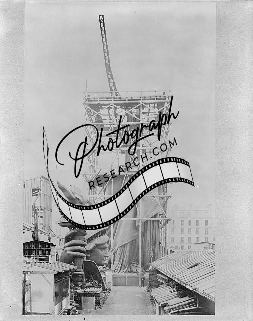 [[Assemblage of the Statue of Liberty in Paris, showing the bottom half of the statue erect under scaffolding, the head and torch at its feet, at the Gaget, Gauthier & Co. workshop in Paris, 1881-1883]]