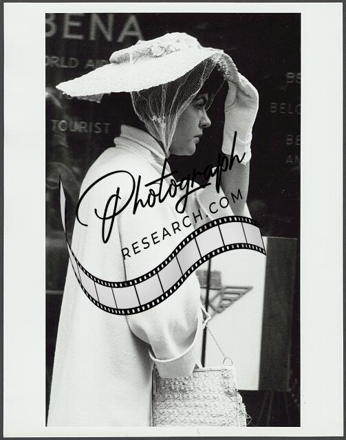 [[Woman holding hat down on her head, carrying purse, half-length portrait, facin
