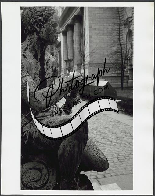 [[Marble lion sculpture adorned with wreath on front steps of the main branch of