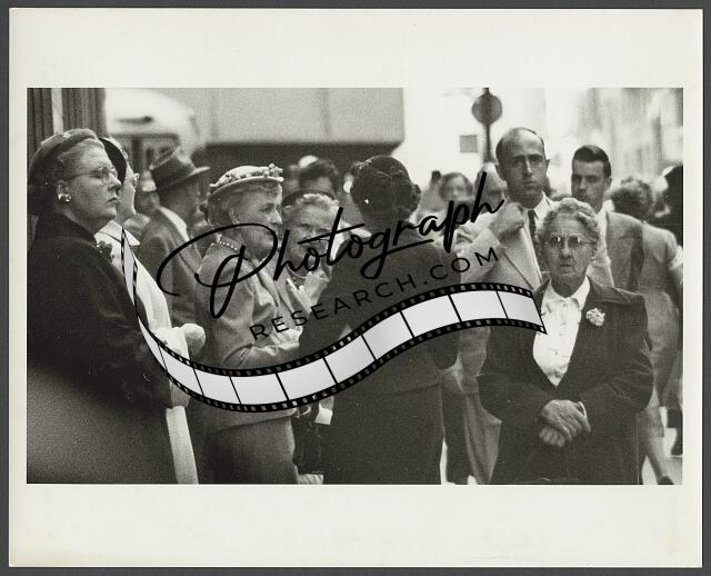 [[Crowd gathered on sidewalk, girl in the middle appears to be holding a micropho
