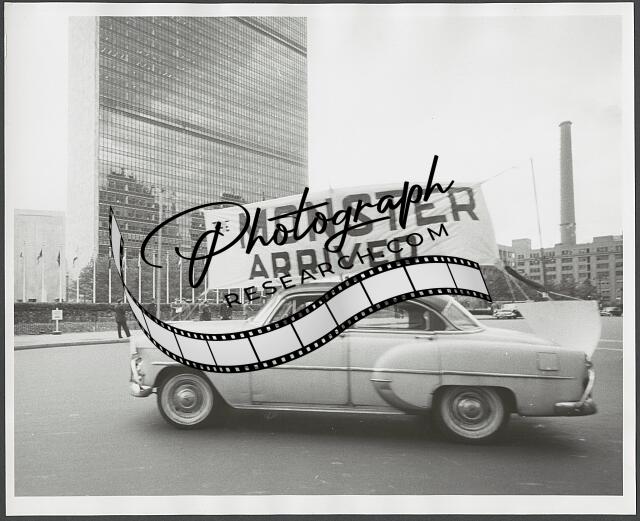 [[Car with protest poster driving in front of the United Nations Headquarters in