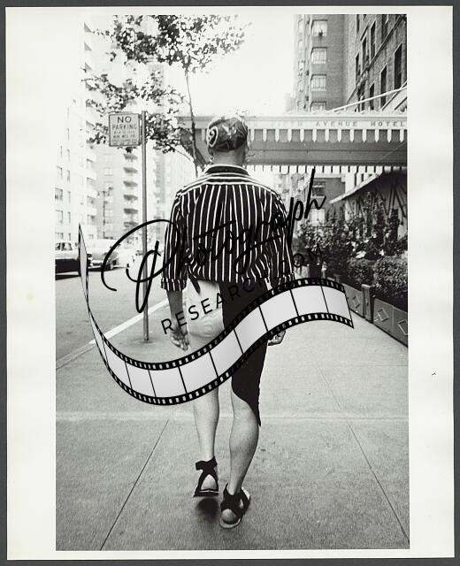 [[Woman, three-quarter length portrait, standing on sidewalk and facing right tow
