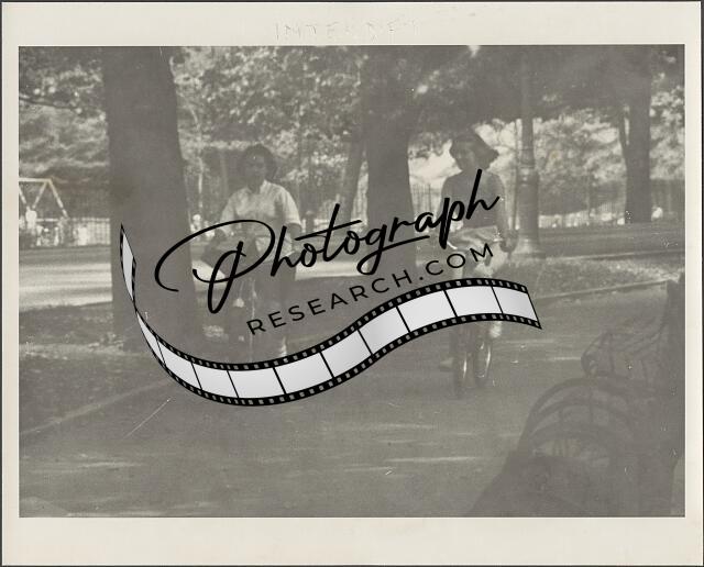 [[Two women riding bicycles in park]]
