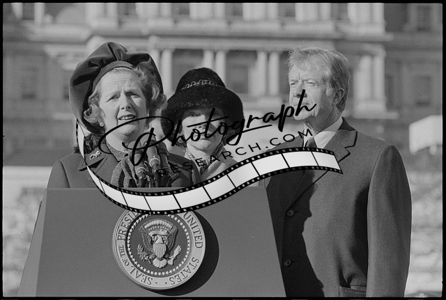 [[Margaret Thatcher, Prime Minister of Great Britain, speaking at a lectern, next