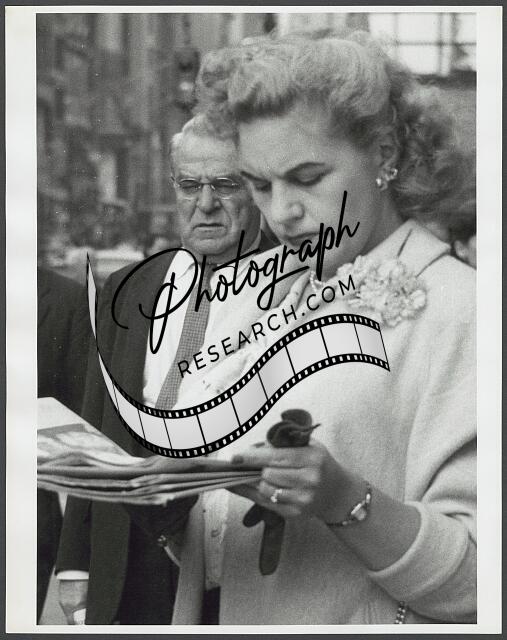 [[Woman, half-length portrait, standing and looking down towards a newspaper in h
