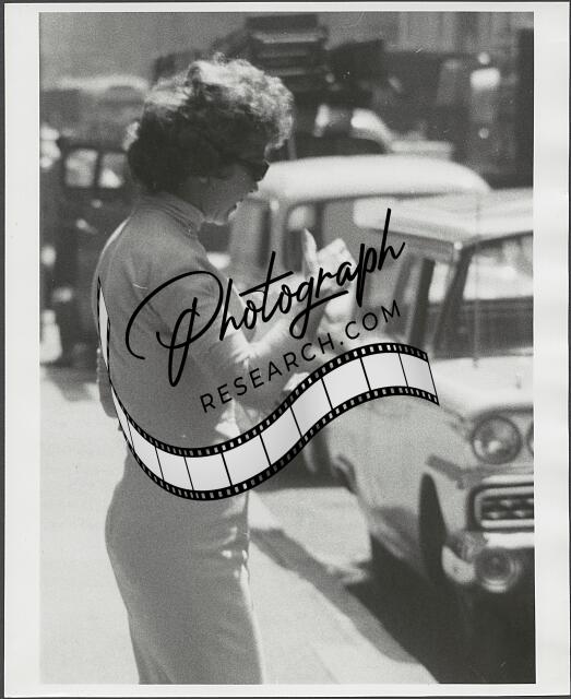 [[Unidentified woman approaching the edge of the sidewalk, cars visible behind he