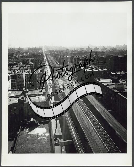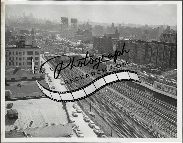 Photograph shows cityscape featuring train tracks leading to the Park Avenue Bridge, also known as the Harlem River Lift Bridge as seen from the Bronx.