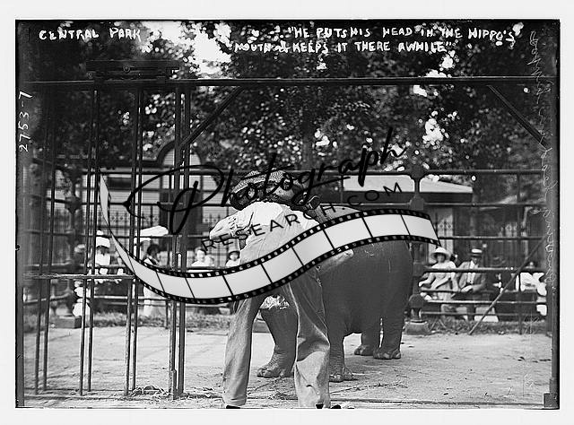 Central Park - man with head in hippo's mouth,1910-1915,animal