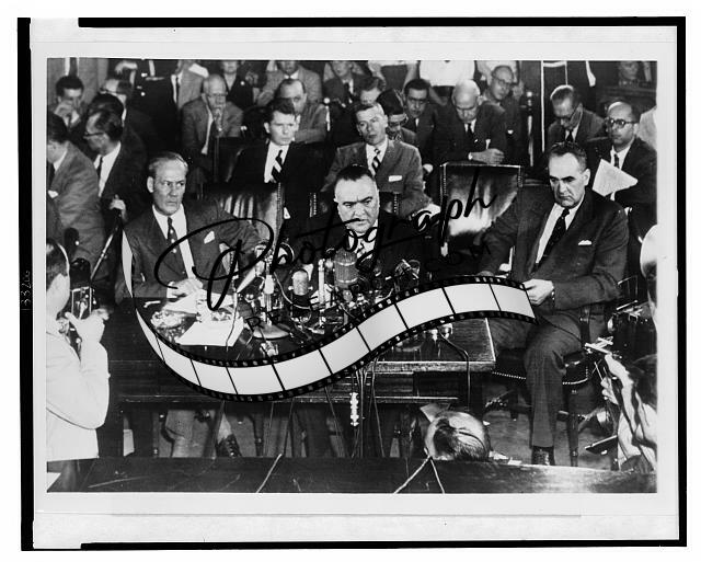 FBI Chief at White hearing,J. Edgar Hoover, seated behind microphones, flanked by (l) Charles Tolson and (r) Lou Nichols, as Mr. Hoover testifies before the Senate Internal Security Subcommittee on the Harry Dexter White case.