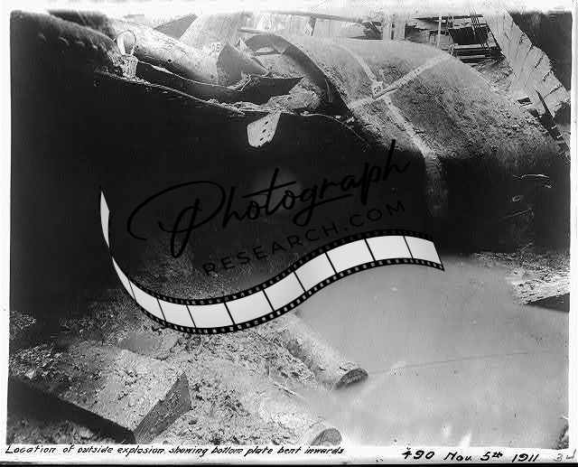 [[Location of outside explosion showing bottom plate of the U.S.S. Maine bent inw