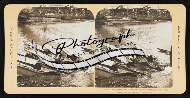 The penny ferry boats beneath the suspension bridge, Manila, P.I.