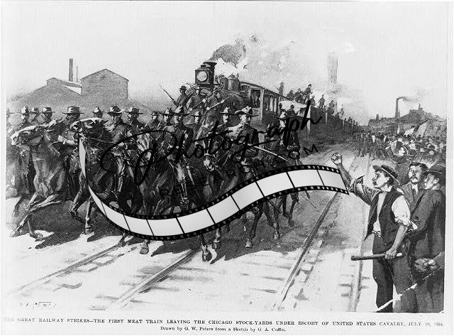 The great railway strikes - the first meat train leaving the Chicago stock-yards