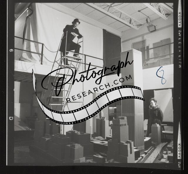 [[World Trade Center, New York, New York. Architect Minoru Yamasaki on a ladder l