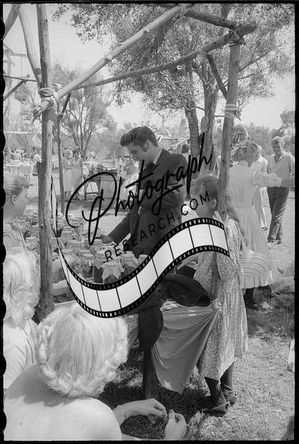 Photograph shows Elvis Presley on the set of the movie Love Me Tender, with a group of young women fans.