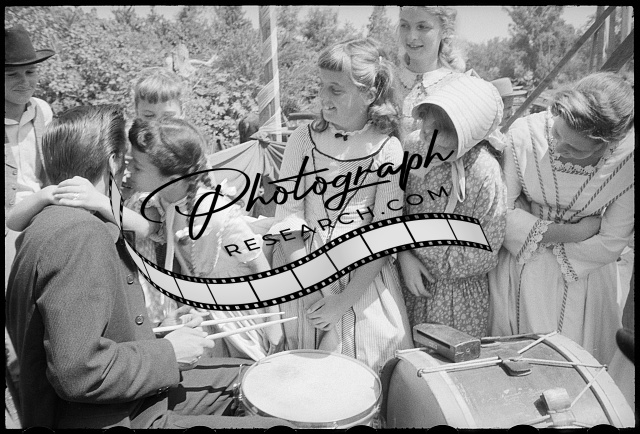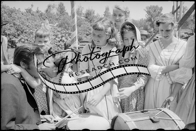 Photograph shows Elvis Presley playing drums as women and girls watch on the set of the movie Love Me Tender.