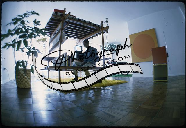 Photograph shows Kenneth Isaacs and his wife Barbara entertaing guests in their apartment using the portable modular furniture ("box-lodging") designed by Kenneth.