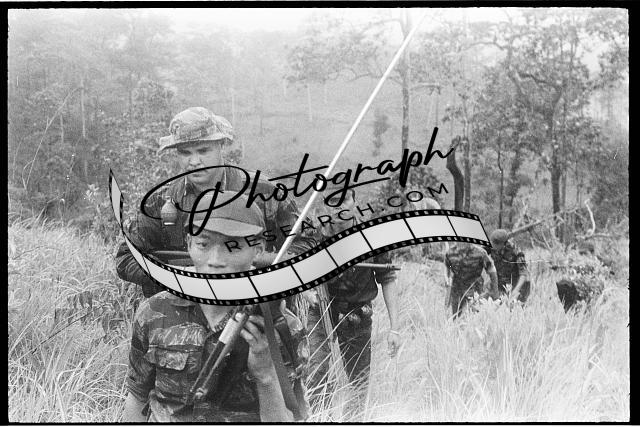 Photograph shows Montagnard military personnel during a U.S. Army Special Forces Detachment A-242 operation among the Montagnard people in the Central Highlands of Vietnam, during the Vietnam War.