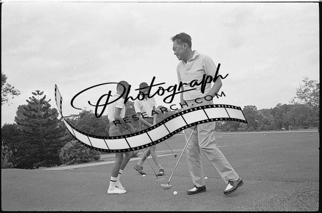 Photograph shows Singapore prime minister Lee Kuan Yew playing golf with his children on the grounds of Istana palace, Singapore.