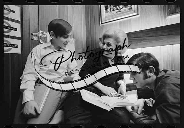 Photograph shows Jean Nidetch, founder of Weight Watchers International outside a theater with a sign advertising her talk, with others.