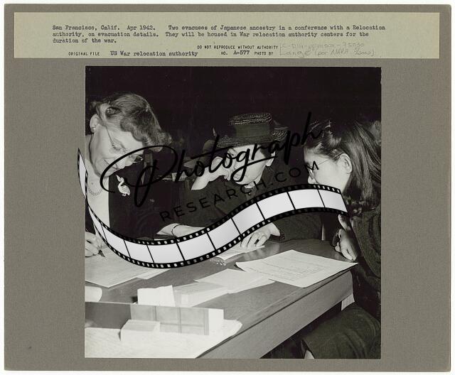 San Francisco, Calif. Apr. 1942. Two evacuees of Japanese ancestry in a conferen