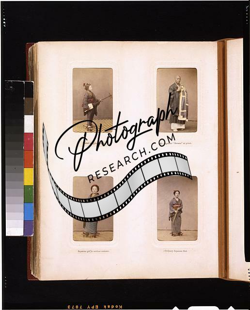 Captions on back of item: 'Japanese guardhouse men' (upper left); 'A Japanese girl at toilet' (upper right); 'Japanese prisoner & police examiner' (lower left); and 'A Japanese girl and the universal guitar' (lower right).