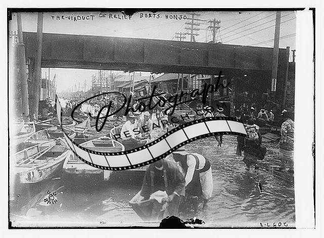 The viaduct - relief boats,Honjo,people in water,carrying things,Bain News