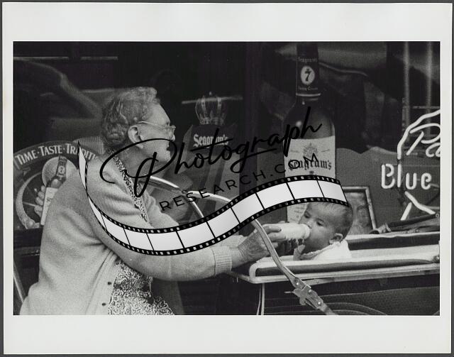 [[Older woman feeding baby with bottle in baby carriage. Signs for Seagram's in w