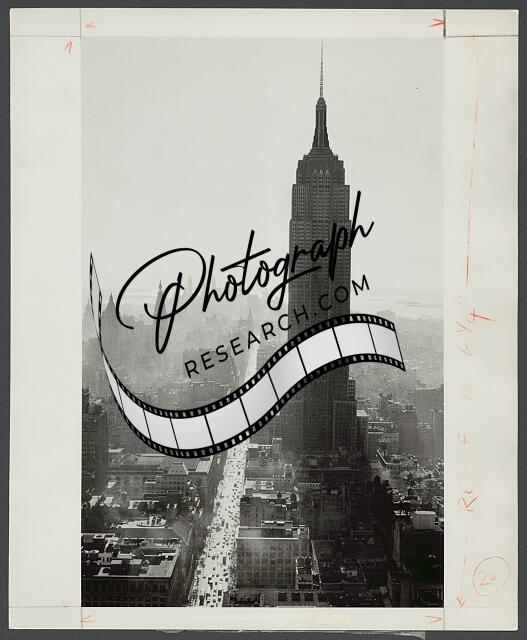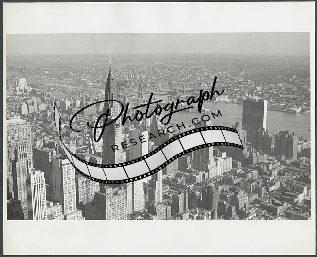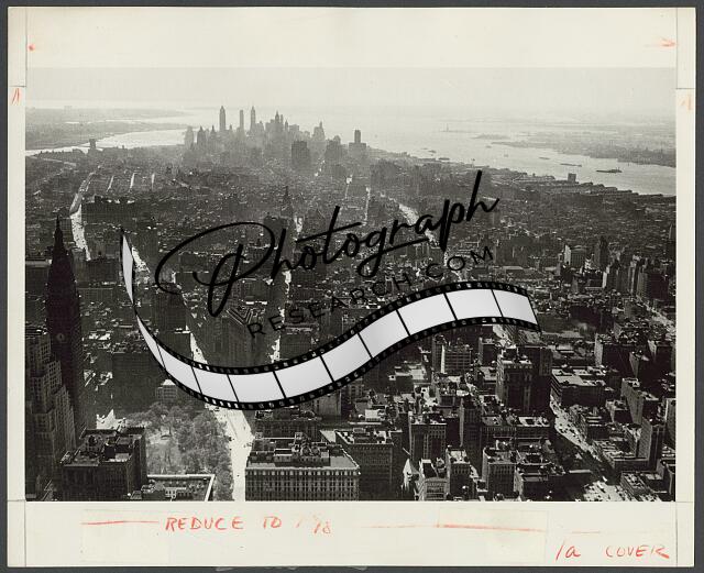 Photograph shows an aerial view of the Manhattan cityscape. The skyscraper at 30 Rockefeller Plaza, formerly known as the RCA building, is featured. Central park is visible in the background.