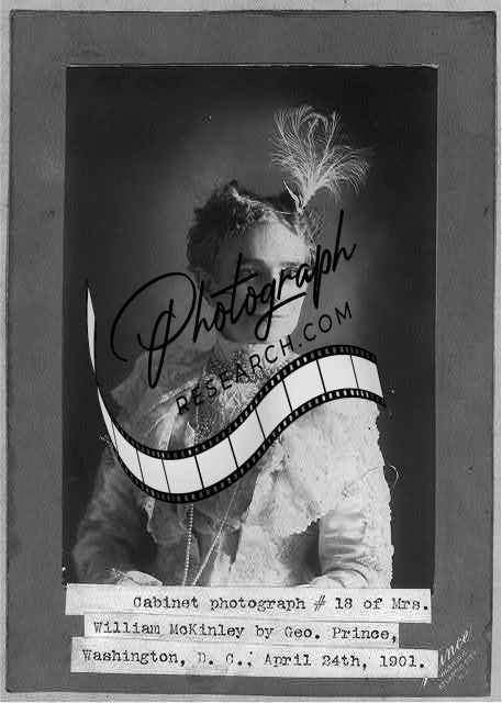 Photograph shows Ida Saxton McKinley, full-length portrait, standing.