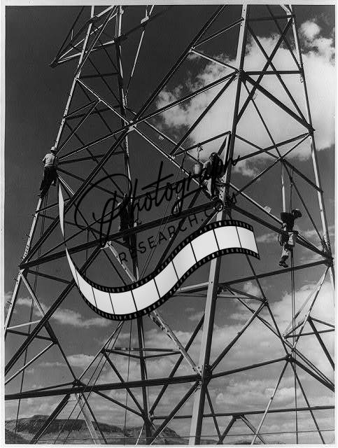 [[Boulder Dam, Colorado. Workers building high voltage tower]]
