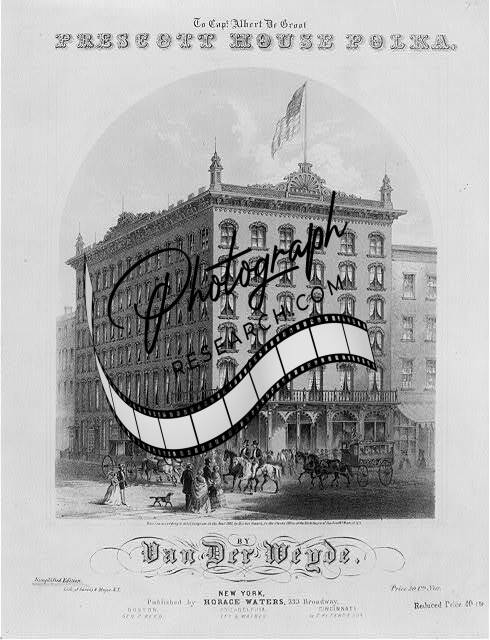 Prescott house polka,by Van Der Weyde,c1853,American flag,exterior view
