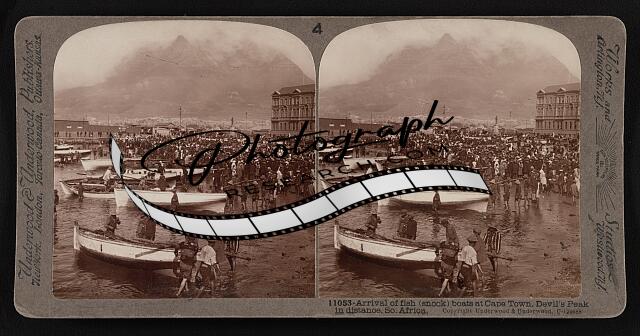 Arrival of fish (snook) boats at Cape Town, Devil's Peak in distance, So. Africa