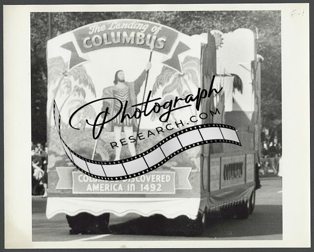 [[Parade float with sign for Columbus, possibly for a Columbus Day parade]]