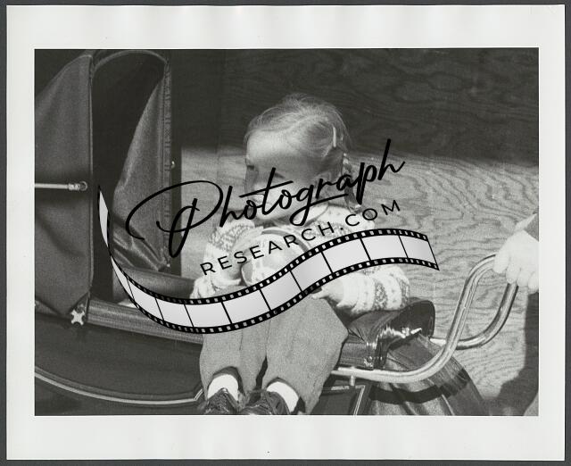[[Girl seated in stroller, legs hanging on side of carriage]]