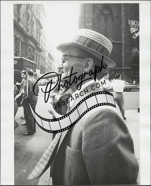 [[Unidentified man in straw hat on the corner of 5th Avenue and E 55th Street, Ne