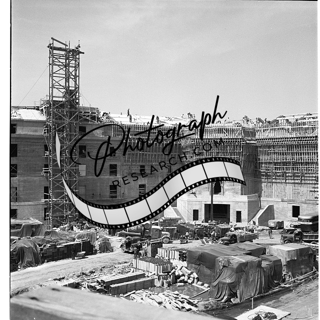 Photograph shows work site for construction of the Pentagon, with building materials in front of unfinished building and workers on the roof.