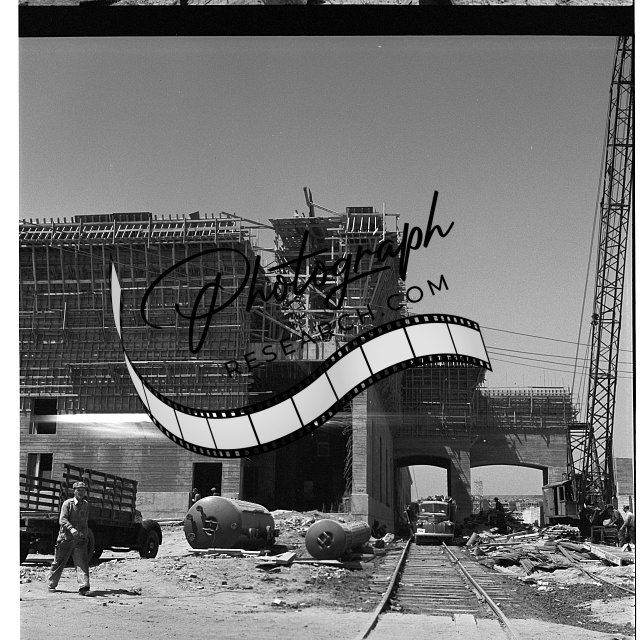 Photograph shows work site for construction of the Pentagon, with building materials and workers in front of unfinished building.