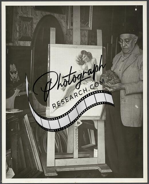 [[Man standing next to easel with image of woman, multiple frames visible in back