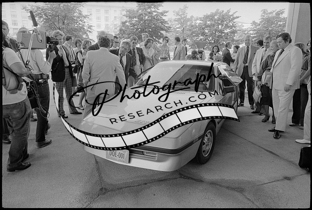 [[People, some with cameras, gathered around a General Electric/Chrysler electric
