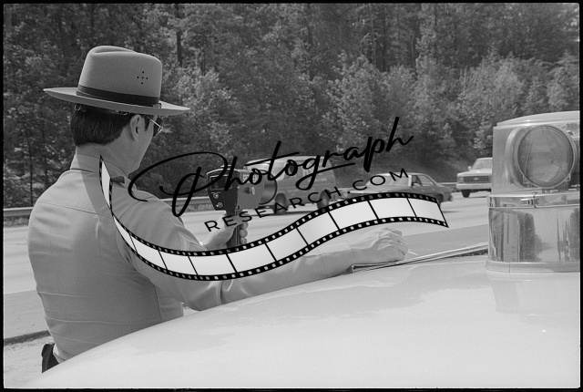 [[Maryland State Police officer, using a radar speed gun while standing next to a