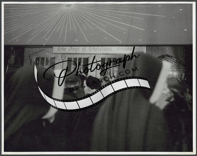 [[Crowd, including two nuns in habits, gathered by a sign reading "The Joys of Ch