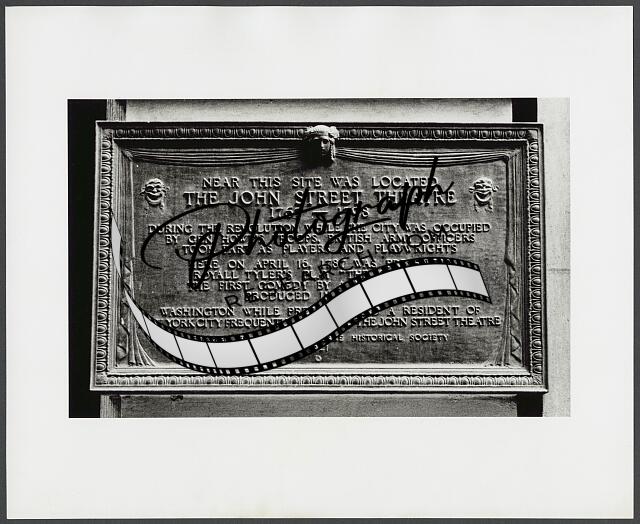 Photograph shows a plaque which reads, "Here stood a bastion of the wall which between 1653 and 1699 extended from the East River along the line of the present Wall Street and thence westerly to the north or Hudson's River. This tablet was erected by the Society of Colonial Wars in the State of New York on the occasion of the Hudson Fulton celebration and unvieled the twenty-ninth Septr. MCMIX".