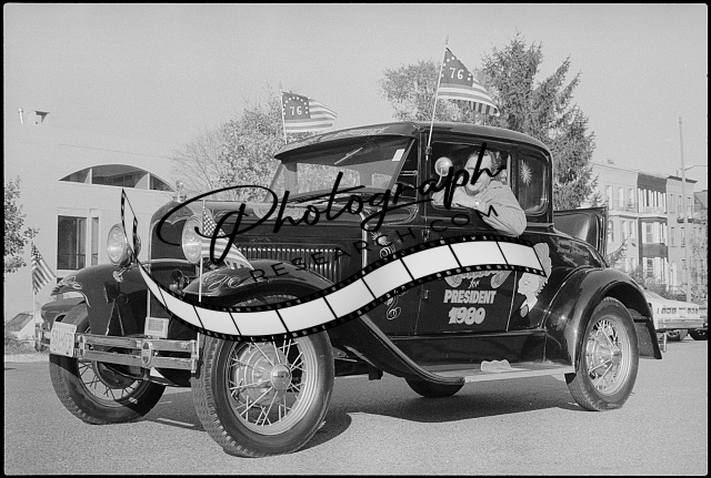 [[Man driving a restored Model A Ford with "Ted Kennedy for 1980" painted on it]]